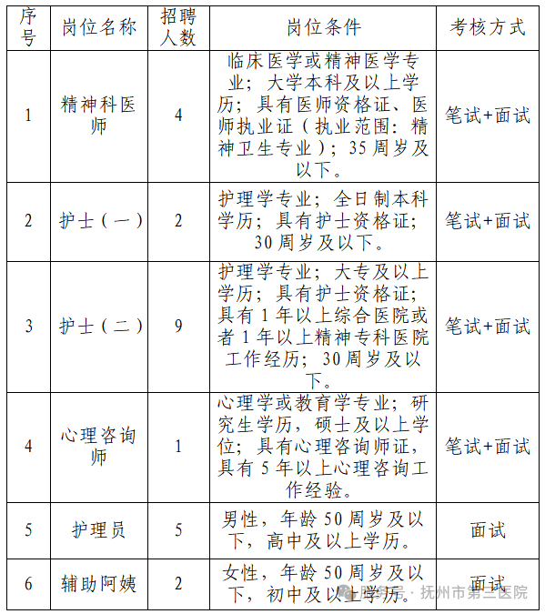 发表时间:2025-09-26 08:46 因业务发展需要,抚州市第三医院拟面向社会公开招聘23名编制外专业技术人员,现将有关事项公告如下: 一、招聘原则 招聘工作坚持德才兼备的用人标准,遵循公开、公平、竞争、择优的原则,招聘全过程接受社会各界及有关部门的监督。 二、招聘岗位和要求(见下表) ![]() 三、招聘条件 (一)应聘人员应当具备下列资格条件: 1.具有中华人民共和国国籍; 2.遵守宪法和法律,拥护中国共产党的领导和社会主义制度; 3.具有良好的政治素质和道德品行; 4.具有招聘岗位所需的任职资格、职业资格、技能要求和身体条件; 5.岗位要求年龄为30周岁以下的,报名人员须为1995年9月22日后出生。其他年龄段要求,以此类推; 6.具备招聘岗位所要求的其他资格条件。 (二)不得报考的情形 因犯罪受过刑事处罚的人员,被开除中国共产党党籍或被开除公职的人员,涉嫌违法违纪正在接受审查调查的人员,尚未解除党纪、政务等处分的人员,在各级公务员、事业单位考试和法律规定的其他国家考试中被认定有严重违纪违规行为尚在禁考期内的人员,被依法列为失信联合惩戒对象的人员,以及法律法规规定不得聘用为事业单位工作人员的其他情形的人员。 四、招聘程序和方法 (一)报名时间 招聘岗位中所列岗位报名时间为2025年9月24日至2025年9月29日,上午8:30—11:30,下午2:00—5:30(限工作日报名)。 采取现场报名方式。投送材料要求(现场报名需提供原件及复印件一份): 1.《抚州市第三医院应聘人员登记表》1张(详见附件); 2.有效居民身份证、各阶段学历学位证书、学信网电子注册备案表及报考岗位要求的其他相关证件材料或工作经历证明材料; 3.近6个月2寸免冠彩色证件照。 为在招聘过程中能及时通知到考生有关招聘事宜,考生在报名表中填写的联系方式务必保持畅通,否则造成的后果自行负责。 (二)考核办法 1.笔试时间:2025年10月9日上午9:00-11:00;面试时间:2025年10月11日上午9:00-11:00。 2.地点:抚州市第三医院门诊医技楼六楼会议室。 3.方式:(1)护理员及辅助阿姨岗位采取直接面试的方式进行。 (2)其他岗位采取笔试和面试两种方式进行。总成绩为100分,其中笔试、面试分数各为100分。考生总成绩计算方法为:笔试及面试成绩各占总成绩50%,均保留至小数点后两位(四舍五入)。岗位笔试内容为相关专业知识;面试主要采取结构化面试方式。未达到开考比例的考生总成绩合格分数线最低72分,否则不予录用。 (三)资格审查工作贯穿于招聘全过程,凡发现报考人员与公告要求的岗位资格条件不符的,立即取消资格。 五、体检、考察、公示、递补 1.体检。根据笔试、面试成绩,按照招收岗位数1:1确定进入体检人员(总成绩相同时按面试成绩从高分到低分的顺序确定),参照事业单位的录用标准进行体检。 2.考察。对体检合格者进行考察,考察需提供无犯罪证明记录。 3.公示。对考察合格的拟聘用人员进行为期5个工作日的公示。 4.递补。因体检、考察、拟聘公示不合格或考生自动放弃造成的空岗,经用人单位同意,按规定程序、时限在报考同一岗位人员中按综合成绩从高分到低分等额依次递补一次。 六、公示及聘用待遇 医院对考试、面试、体检、考察合格的拟聘用人员名单统一公示,公示期为5个工作日;公示期满,对没有问题或者反映问题不影响聘用的,与聘用人员签订聘用合同,试用期按医院有关规定执行。聘用期满,经考核合格者予以聘用。凡聘用期考核不合格者予以解聘。聘用人员工资福利和社会保险待遇按医院有关编外聘用人员规定执行。 七、其他事项 本公告由医院组织人事科负责解释。 联系电话:0794-8238160 地 址:抚州市第三医院门诊医技楼4楼办公室 声明:此篇文章内容为江西向上教育整理发布/转发文章,具体以原公告为准,此文链接:https://www.xsdkjy.com/sys-nd/1506.html